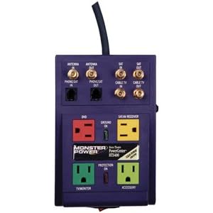 - 1665 joules protection, 4 color-coded, component specific outlets, 3 coax outlets for cable, satellite and UHF/VHF, 1 phone line for pay-per-view hookup, Audible surge alarm, visual surge indicator, 2